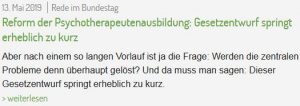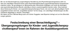 „….Auch die Kinder- und Jugendlichen-Psychotherapie wird unter dieser Psychologisierung leiden. Während es bisher auch Angehörigen pädagogischer Berufe möglich war, eine solche Therapieausbildung zu machen, wird dieser Zugang künftig entfallen, der einen bewährten praktischen Erfahrungsschatz für die Arbeit mit Kindern und Jugendlichen garantierte. Problematisch auch, dass das neue Studium kaum Praxisanteile enthält, wie sie eigentlich zur Erteilung einer Approbation nötig wären. So ist nicht einmal verbindlich vorgesehen, dass Studierende therapeutische Gespräche mit Patient_innen unter Supervision erlernen. Hier besteht dringender Nachbesserungsbedarf…..“