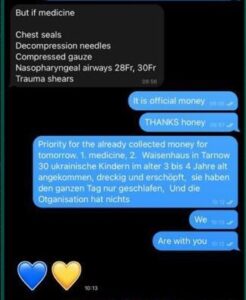 Es gibt nun eine andere Organisation, mit der wir zusammenarbeiten. Die Organisation heißt Blau-Gelbes Kreuz e.V. Der Blau-Gelbes Kreuz e.V. ist ein staatlich anerkannter, gemeinnütziger Verein mit Sitz in Köln, der bereits seit 2014 die Entwicklung einer freien, demokratischen Ukraine unterstützt und Hilfe für die Opfer des Krieges, insbesondere für Kinder, Binnenflüchtlinge, Verletzte und andere stark bedürftige Menschen aus den vom Krieg betroffenen Regionen leistet. Die Spenden werden für Hilfsgüter und medizinisches Material für die Menschen an der Grenze und in der Ukraine verwendet.