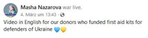 Hier der Facebook-Blog von Masha Nazarova, einer Sanitäterin, die schon die Ukraine verlassen hatte, aber zurückgekehrt ist, um Verwundeten zu helfen: